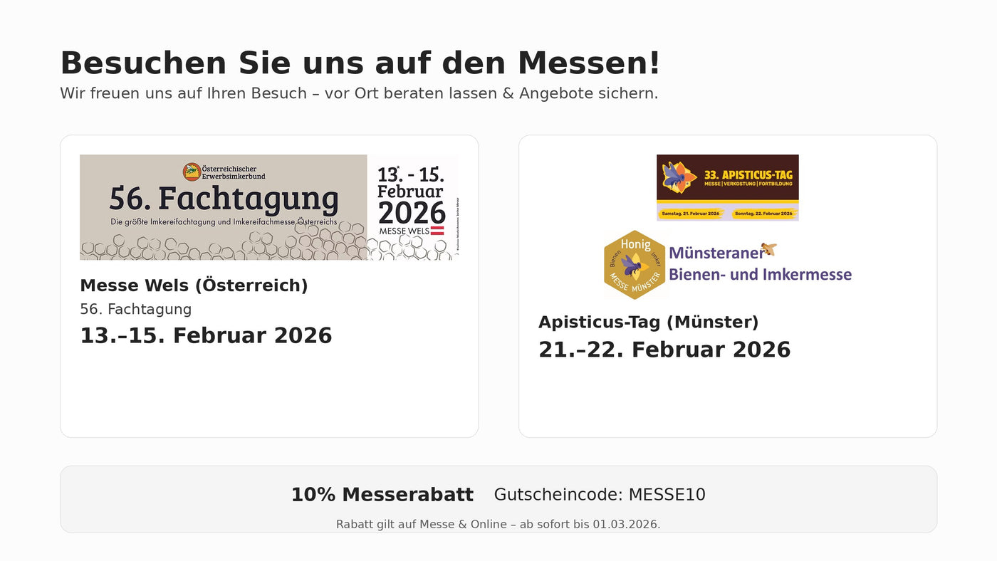 Would you like to experience our products firsthand? Feel free to visit our warehouse in Iserlohn and see the quality for yourself. Is that too far? No problem – we regularly attend the most important beekeeping trade fairs in Germany and Austria.