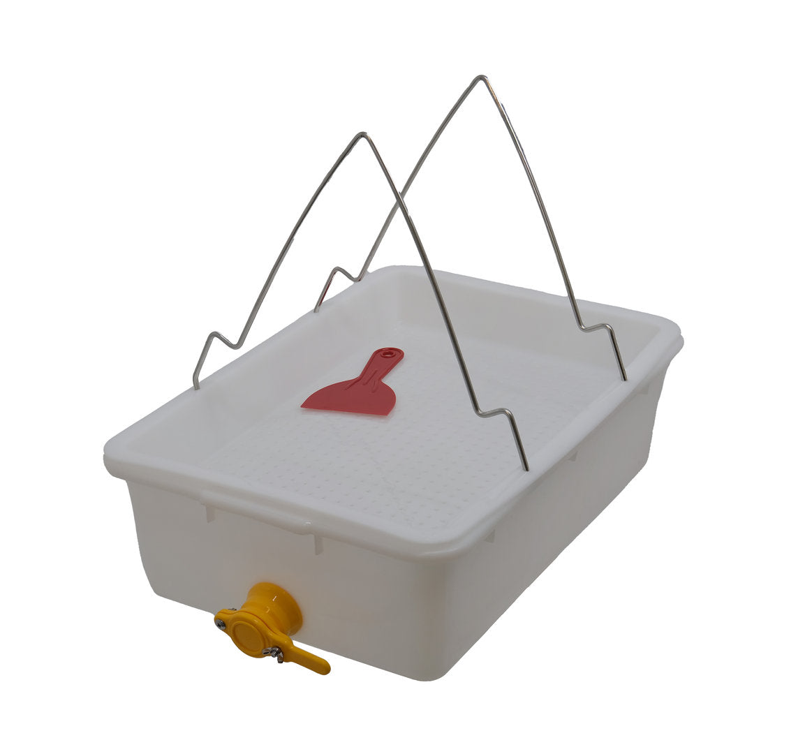 The uncapping tray, complete with plastic filter and tap, is an indispensable tool for beekeepers to quickly and easily uncap their honeycombs. Equipped with a plastic filter, this high-quality uncapping tray allows beekeepers to process their honeycombs effortlessly. Compatible with all standard frames, the tray ensures that the capping wax remains on the filter while the honey flows into the collection tray below. The honey can then be easily drained using the tap. Lightweight, easy to handle, and simple to clean, the uncapping tray is made of high-quality plastic and stainless steel and is completely food-safe. The tray measures 60 cm in length, 40 cm in width, and 15 cm in height. Get the complete uncapping tray with plastic filter and tap now and make beekeeping easier!