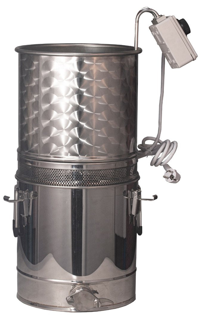 The Bienenwagner Honeytherm is the ideal solution for gently heating, cleaning, and filtering your honey. Made of high-quality CD stainless steel (1.5 mm sheet thickness), it is compatible with most 25 kg, 30 kg, and 50 kg bottling machines, as well as our 25 kg plastic honey bucket .