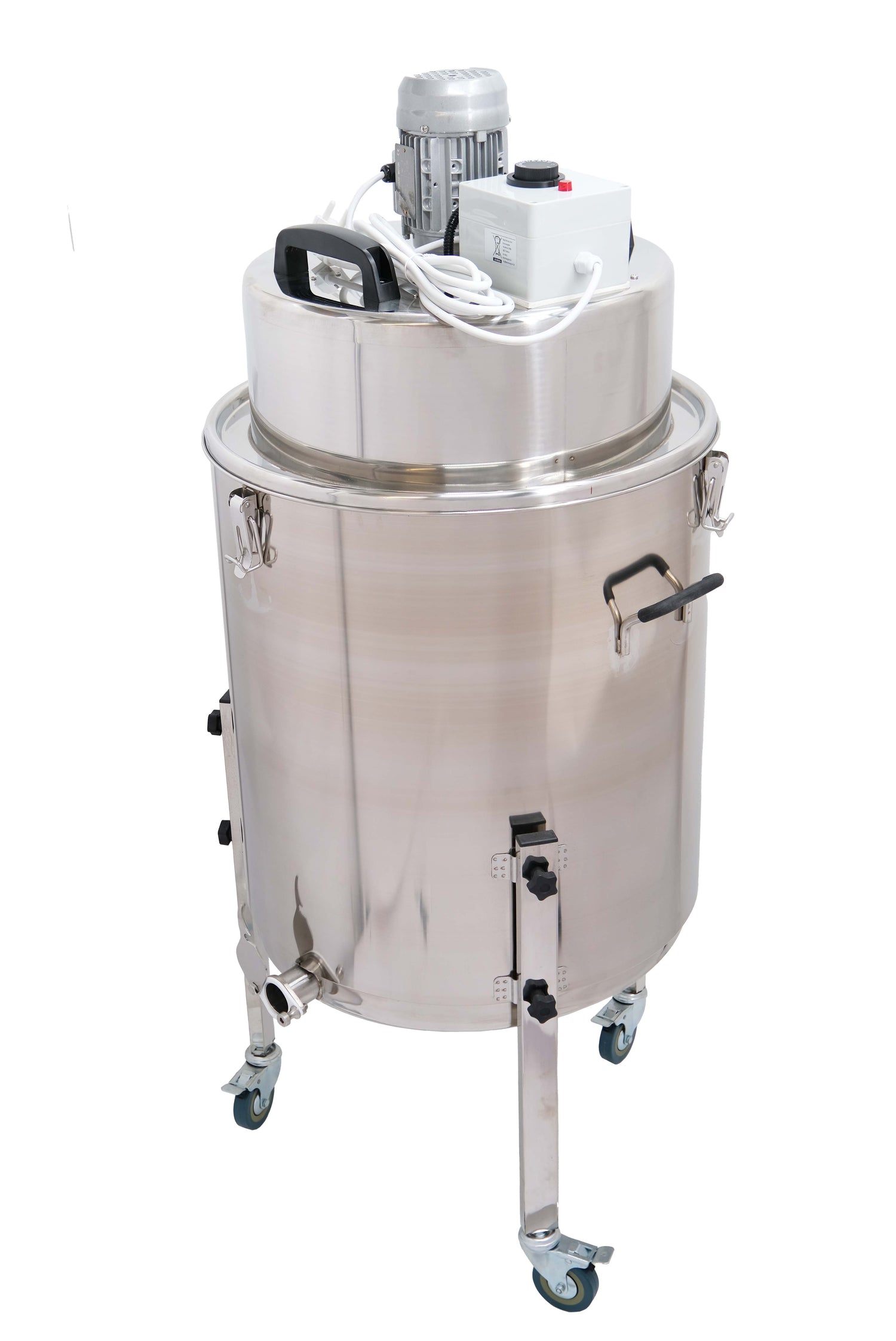Merci au Chauffage intégré dans le couvercle en combinaison avec un puissant ventilateur de circulation d'air la température est répartie uniformément dans toute la bouilloire en acier inoxydable. Pendant le processus de fusion, le miel s'accumule protégé au fond, recouvert par la cire du couvercle fondue - c'est ainsi qu'il reste protégé de la surchauffe et maintient sa qualité.